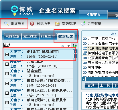 继续搜索功能是指,针对未搜索完毕的内容,可以从上回搜索中断处,接着搜索新的数据,可以大幅节约大家的时间,同时也提高了工作的灵活性,今天搜索不完,明天接着继续搜索,首先在【搜索历史】中,选择上回未搜索完毕的内容,点击工具栏上方的【继续搜索】按钮即可