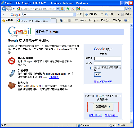 3.如上图,点击[创建帐号],即可创建自己的GMail邮箱,点击[我接受,创建我的账户]完成最后的创建。