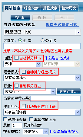 阿里巴巴网站自身最多只提供了前500页,500页以后的数据没有提供,针对这个问题,博购提供了搜索条件自动拆分功能,可以按照城市,经营模式,注册年份,行业等多种方式来拆分搜索条件,将原本的一个搜索任务自动的拆分成多个搜索任务后,即可搜索到大于500页的数据。
