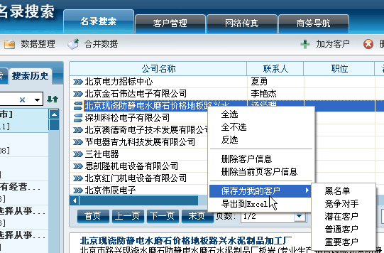 在【搜索历史】中,选择客户信息,点击右键菜单,即可将选择的客户添加到客户管理中
