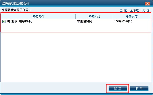 继续搜索功能是指,针对未搜索完毕的内容,可以从上回搜索中断处,接着搜索新的数据,可以大幅节约大家的时间,同时也提高了工作的灵活性,今天搜索不完,明天接着继续搜索,首先在【搜索历史】中,选择上回未搜索完毕的内容,点击工具栏上方的【继续搜索】按钮即可