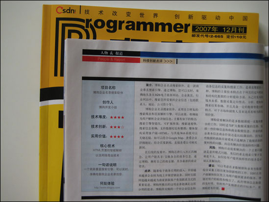 博购企业名录搜索软件,作为科技创新产品发表于 程序员杂志 2007年 12月刊。